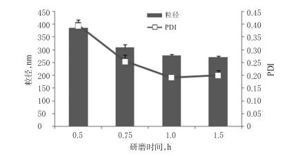 2.1.3研磨時(shí)間的篩選稱取BRE原料藥7.5g,置于含有吐溫80(1.125g)的水溶液(22.5mL)中,攪拌混懸,加入氧化鋯珠(粒徑為0.6mm)450g,分別研磨0.5、0.75、1.0、1.5h,制備3批BRE納米晶混懸液。以BRE納米晶混懸液的粒徑、PDI為指標(biāo),篩選研磨時(shí)間。結(jié)果,隨著研磨時(shí)間的延長,BRE納米晶混懸液的粒徑、PDI逐漸減??;研磨0.5、0.75、1.0h時(shí),BRE納米晶混懸液的粒徑、PDI減小的幅度較大;研磨1.5h時(shí),BRE納米晶混懸液粒徑雖然較研磨1.0h時(shí)的粒徑減小,但減小幅度不大。綜合考慮能耗和時(shí)間,確定研磨時(shí)間為1h。研磨時(shí)間的篩選結(jié)果見圖3。